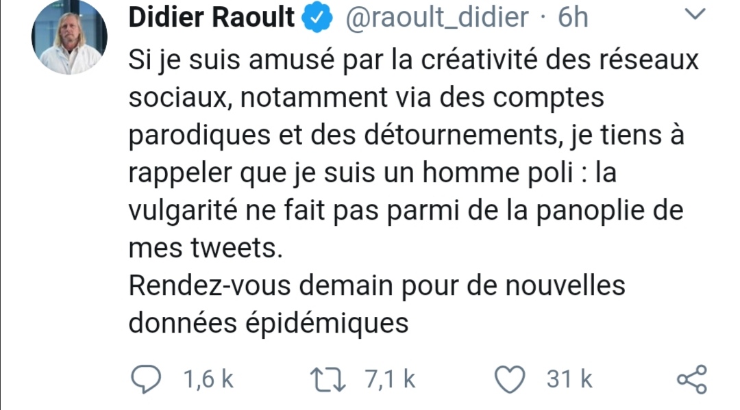 Directeur de l’IHU Méditerranéen infection. Professeur de Médecine. Infectiologue. Microbiologiste. Compte parodique et non officiel