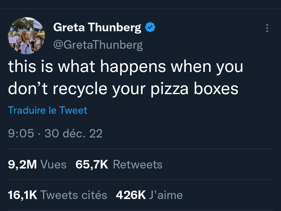 edit: à ce rythme là le burn de Greta va finir Tweet le plus liké de l'histoire https://twitter.com/GretaThunberg/status/1608056944501178368