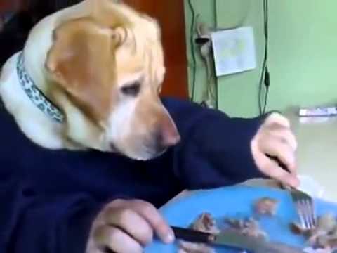 Un chien mange à table