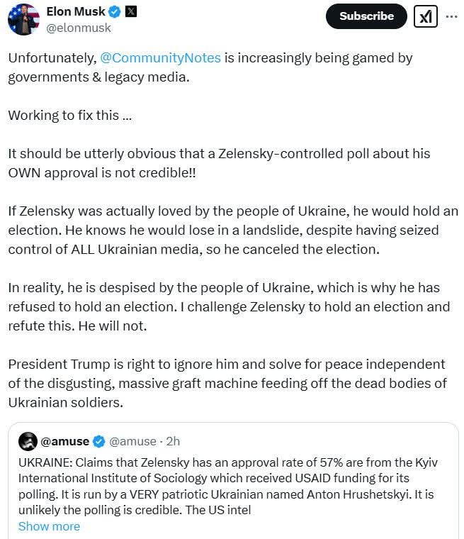 Musk est un danger, il est nécessaire que le plus de gens possible s'opposent à lui. Autant j'apprécie le concept de coup de pied dans la fourmilière, autant ici il piétine ladite fourmilière, personne n'a intérêt à ce qu'il continue ses frasques.