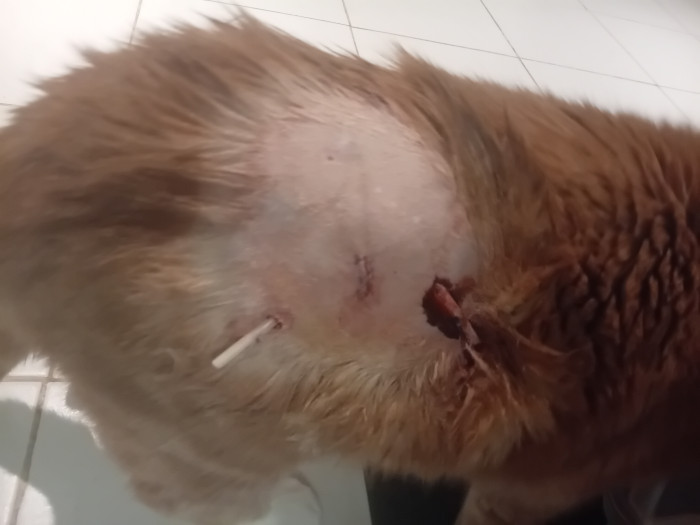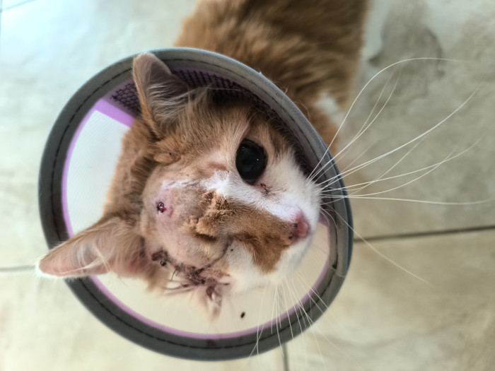 En fait, l'abcès s'est percé de lui-même et la peau est morte. Il a fallut refaire une couture. En plus (pour ne rien arranger) son œil avait été enlevé suite à une infection précédente. Aujourd'hui, son œil valide ne l'est plus. Il a un voile blanc dessus. Mais il continu d'aller dehors, se prend un mur de temps en temps ... Il me trouve facilement dans la maison pour réclamer (à sortir ou à manger et occasionnellement des carresses) donc, tout va bien.