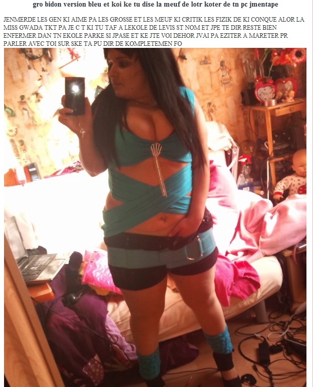 Omagad ... Les plupart des "grosses" sont attirantes en général, mais si j'étais elle, j'arrêterais de faire ma belle ... Style vestimentaire : 0, elle fait aucun effort pour se mettre en valeur, quel bordel y a tout autour d'elle, la main dans le pli du ventre =/, la tapisserie tout moche ... Bref, j'comprend pourquoi on se fout de sa gueule.