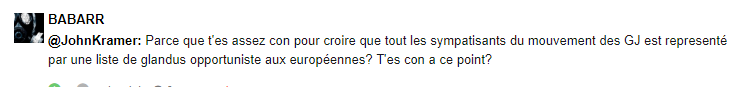 Parce que t'es assez con pour croire que tout les sympatisants du mouvement des GJ est representé par une liste de glandus opportuniste aux européennes? T'es con a ce point?