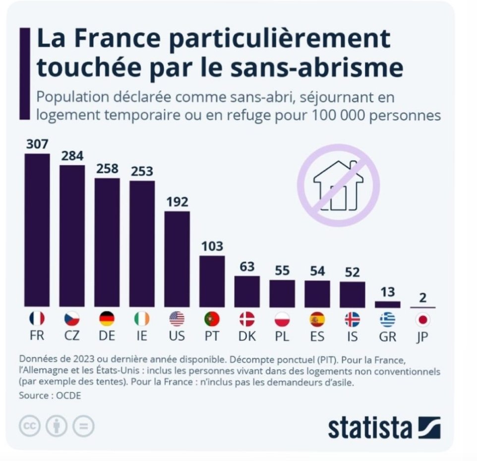 Selon les dernières données de l’OCDE, la France compte environ 333 000 personnes sans domicile, ce qui en fait l’un des pays avec le plus grand nombre de sans-abris en chiffres absolus, juste derrière le Royaume-Uni (environ 400 000) et devant l’Allemagne (263 000).