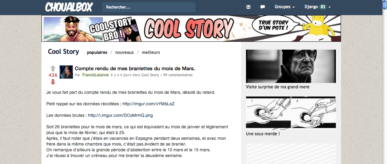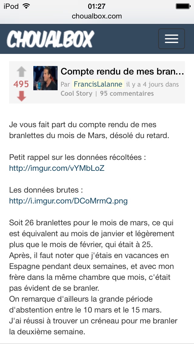 Tu m'as surtout fais pitié. Faire des stats sur ses branlettes, j'imagine la vie sociale épanouissante qui se cache derrière.