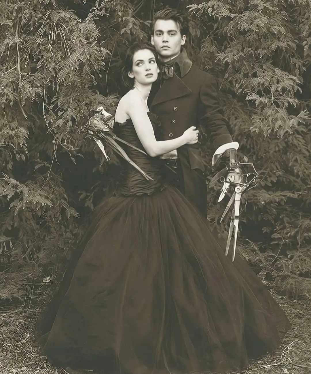 Winona Ryder et Johnny Depp sur le tournage du film Edward aux mains d'argent réalisé par Tim Burton (1990)