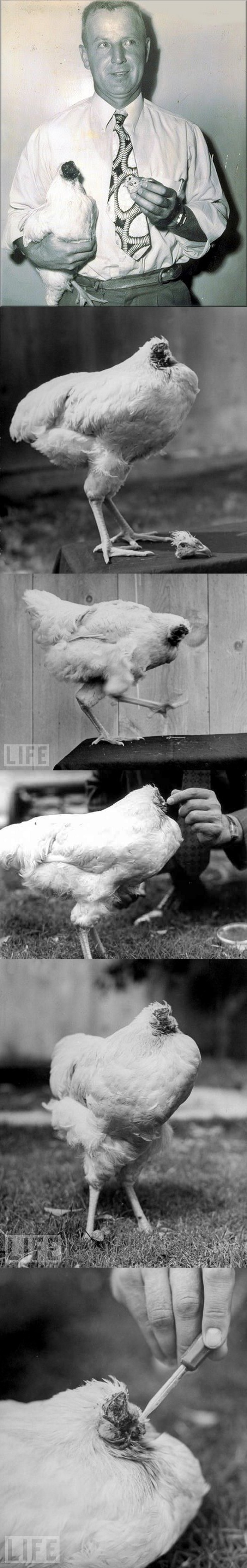 *Ce poulet dénommé Mike a vécu 18 mois après que sa tête ai été coupée avec une hache.