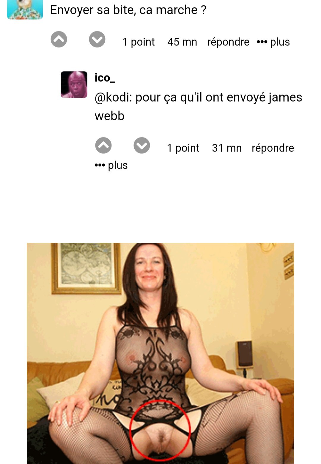 j'ai peut-être une piste : "envoyer sa bite", pas de bite entre les jambes car envoyée dans l'espace... J'sais pas, je cherche... ou alors il vient d'avoir une révélation sur l'anatomie féminine.