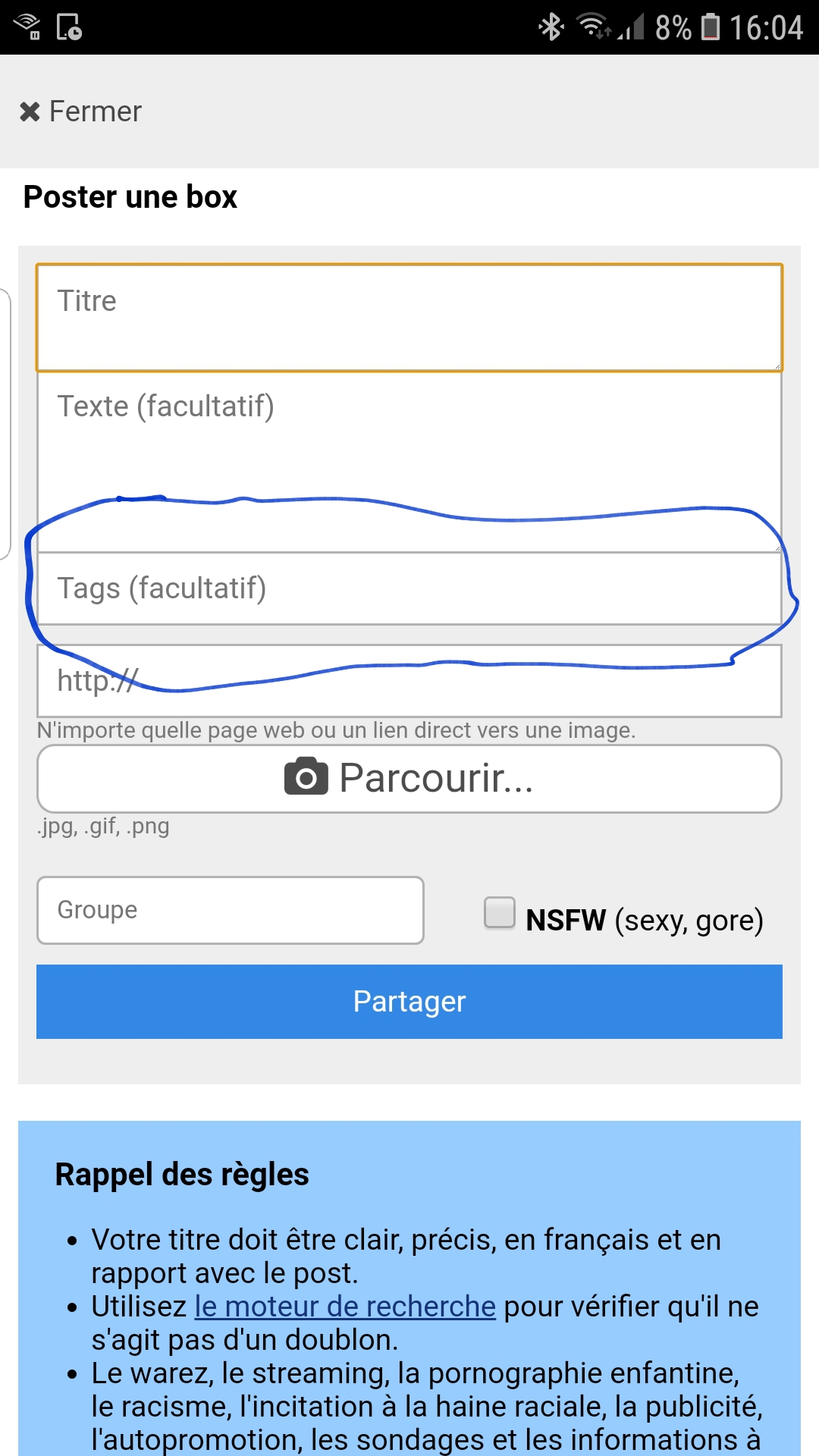 dans ce cas précis tu met genre " chiotte merde record du monde", pour que si quelqun veut poster la même image il puisse retrouver ta box et voir que c'est déjà sur le site, et donc ne pas la reposter.