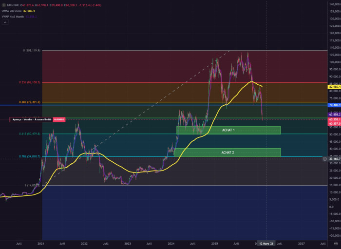 Voici mes entrées, sans être un expert technique. En bleu mon PRU actuel 70k que je dois faire baisser au max. Toute la Zone 51k à 34k, ça reste une zone en or (61.8 et 78.6 de Fibo)