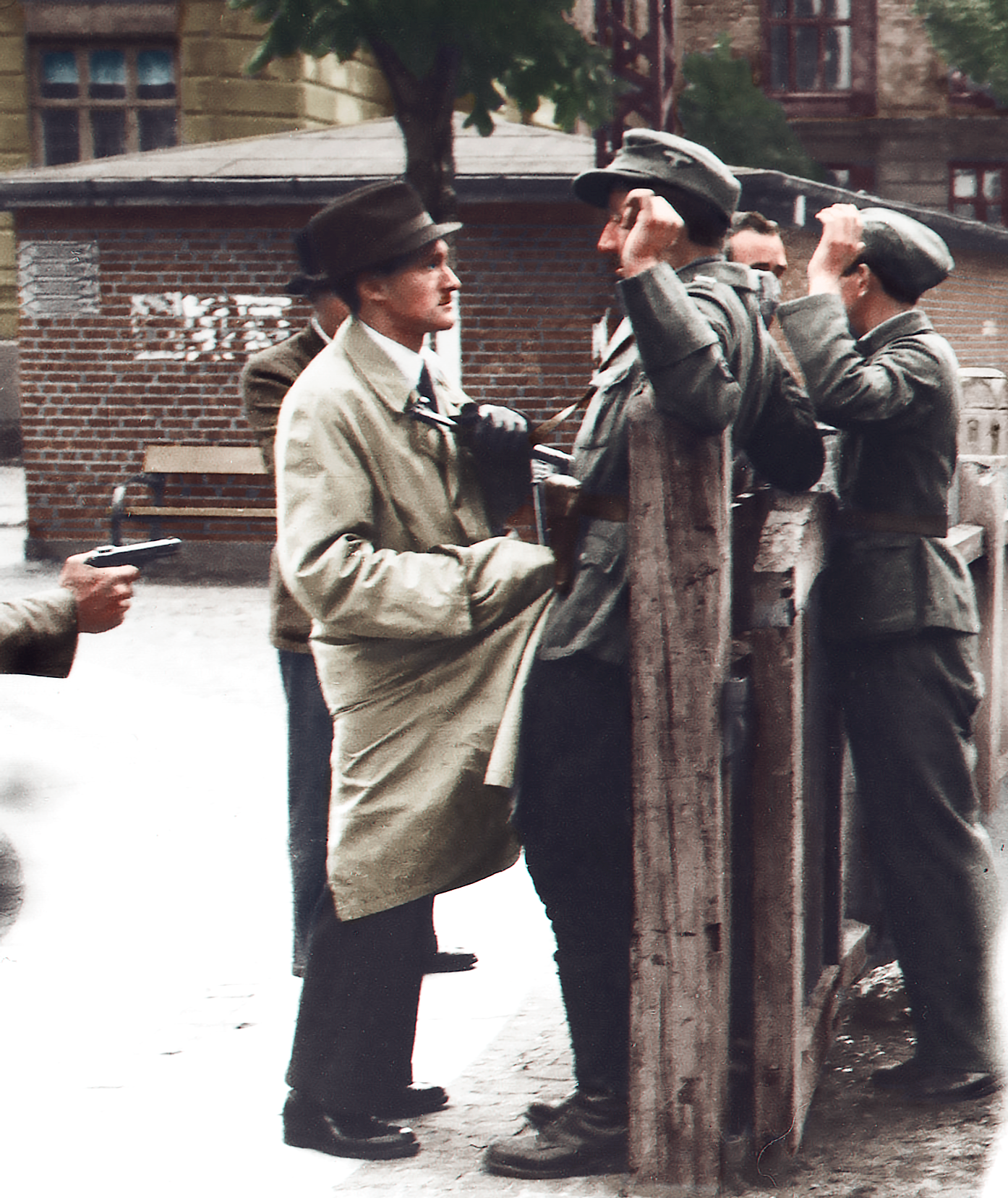 Source: https://www.reddit.com/r/HistoryPorn/comments/ajqor1/german_soldiers_held_up_and_disarmed_by/