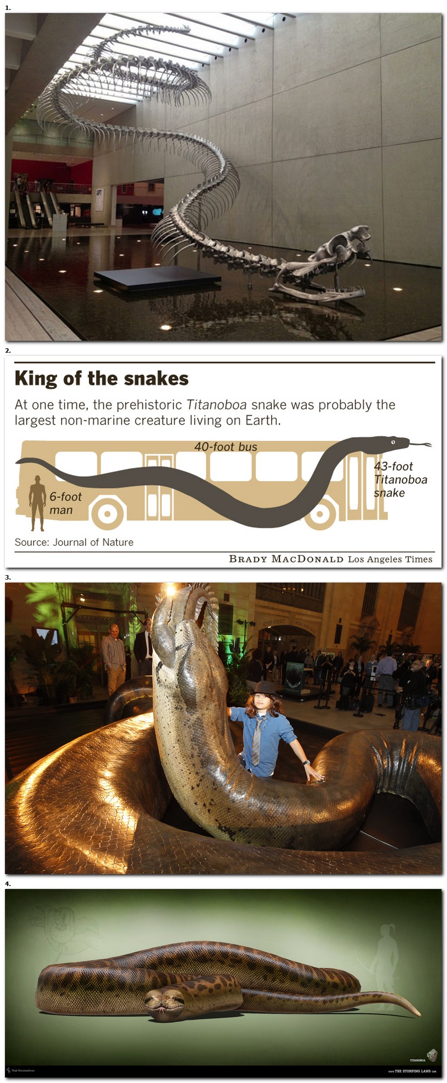 Le paléontologue Jonathan Bloch compara dans l'ordre de grandeur ce serpent au Tyrannosaurus rex, tant en termes de longueur que de gigantisme. Expert dans l'évolution des vertébrés, il estima également qu'« après l'extinction des dinosaures, ce Titanoboa était le plus gros prédateur de la Terre pendant au moins 10 millions d'années ».