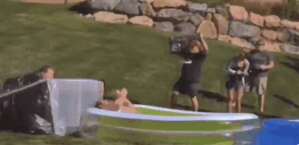J'ai la fin, il tombe entre les 2 piscines bleues et les éclate. Il se retrouve comme un gros con en étoile de mer sur l'herbe et tout le monde se fout de sa gueule.