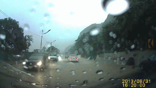 'Tain, la voiture s'est fait décalée par la masse de flotte juste avant que le rocher tombe! Il a le cul bordé de nouilles lui!