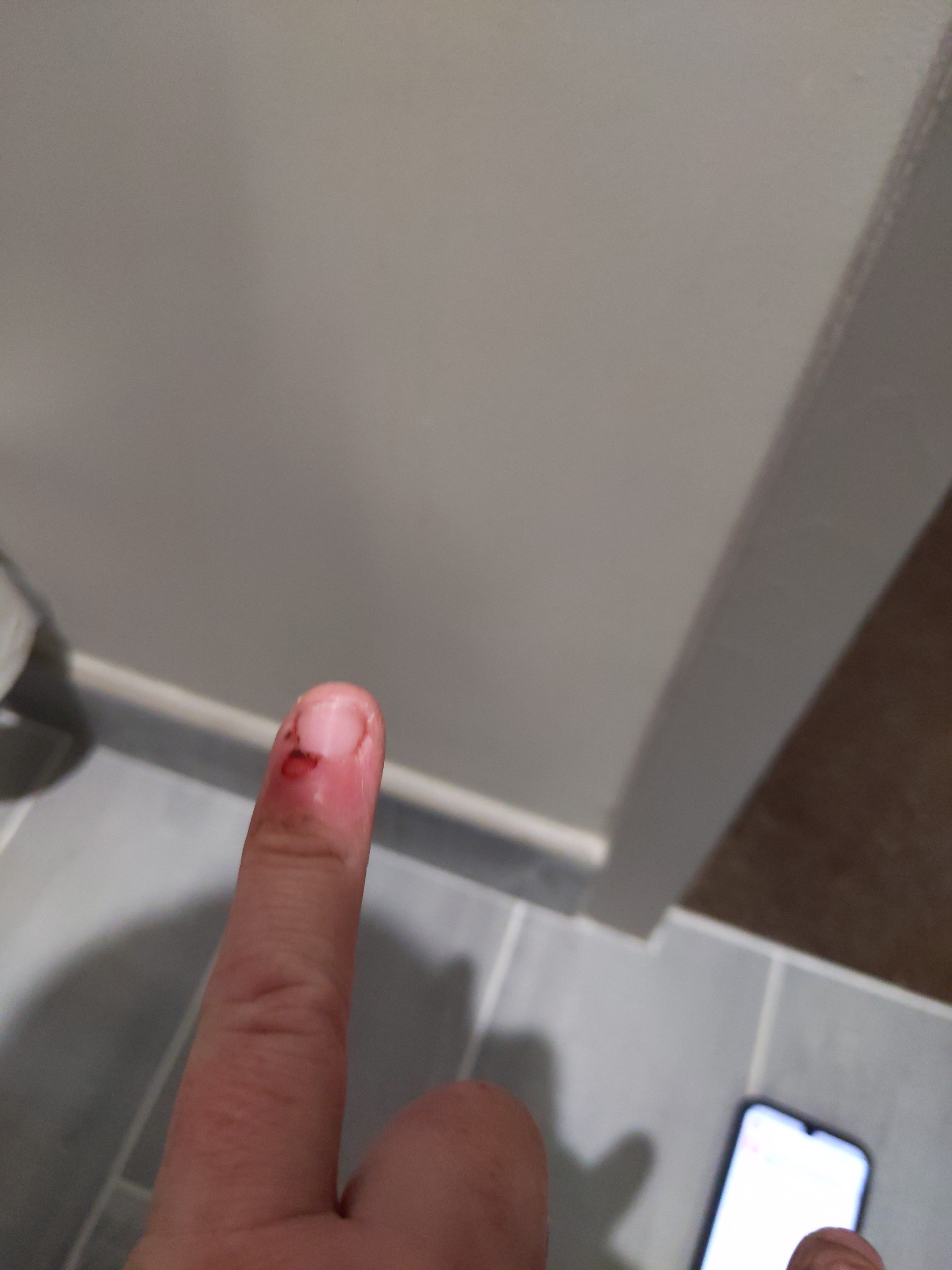 c’est toute ma jambe qui a traversé la porte. J’ai des petites griffures ailleurs, mais superficielles