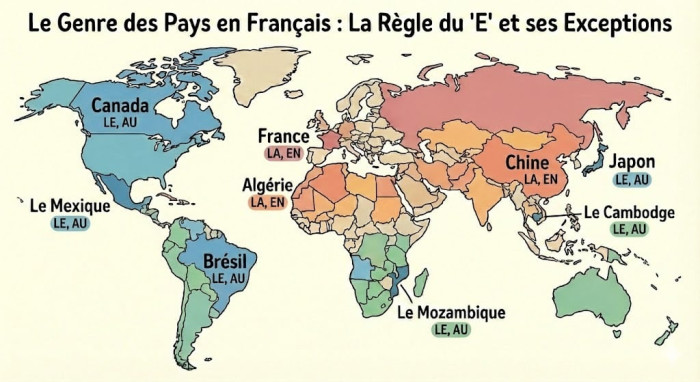 C’est la règle la plus simple et elle fonctionne dans 99 % des cas. Le genre est déterminé par la dernière lettre du nom du pays.