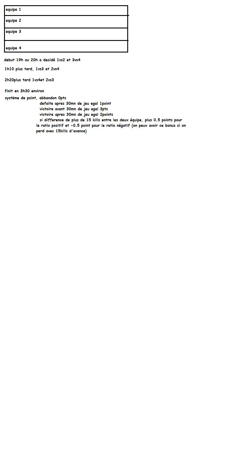 Maintenant tout les joueurs vous allez me donner vos pseudo sur lol et votre niveau, je ferait un tableau de rencontre avec l\'heure des match! Pour le bon déroulement du tournois, veuillez être a l\'heure, si il manque un joueur à une équipe, vous jouerez à 4 mais on ne changera plus les équipes!