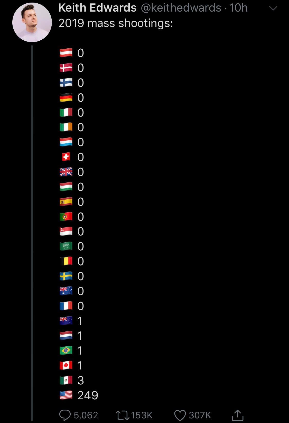 De ce que j’ai vu, la majorité des fusillades de masse ont lieux là où les armes sont interdites ou très peu répandues. Donc je pense qu’au contraire, pour les USA du moins, il faudrait que tout le monde soit armé...