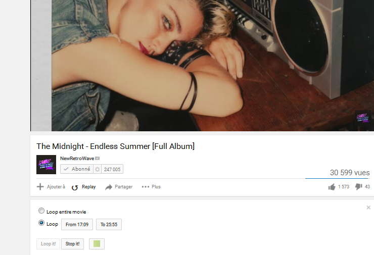 Petite extension pour rejouer tout une vidéo ou une partie d'une vidéo à l'infinie. Pratique quand on écoute des compils de musique en ligne. Devenu un indispensable pour moi très rapidement.