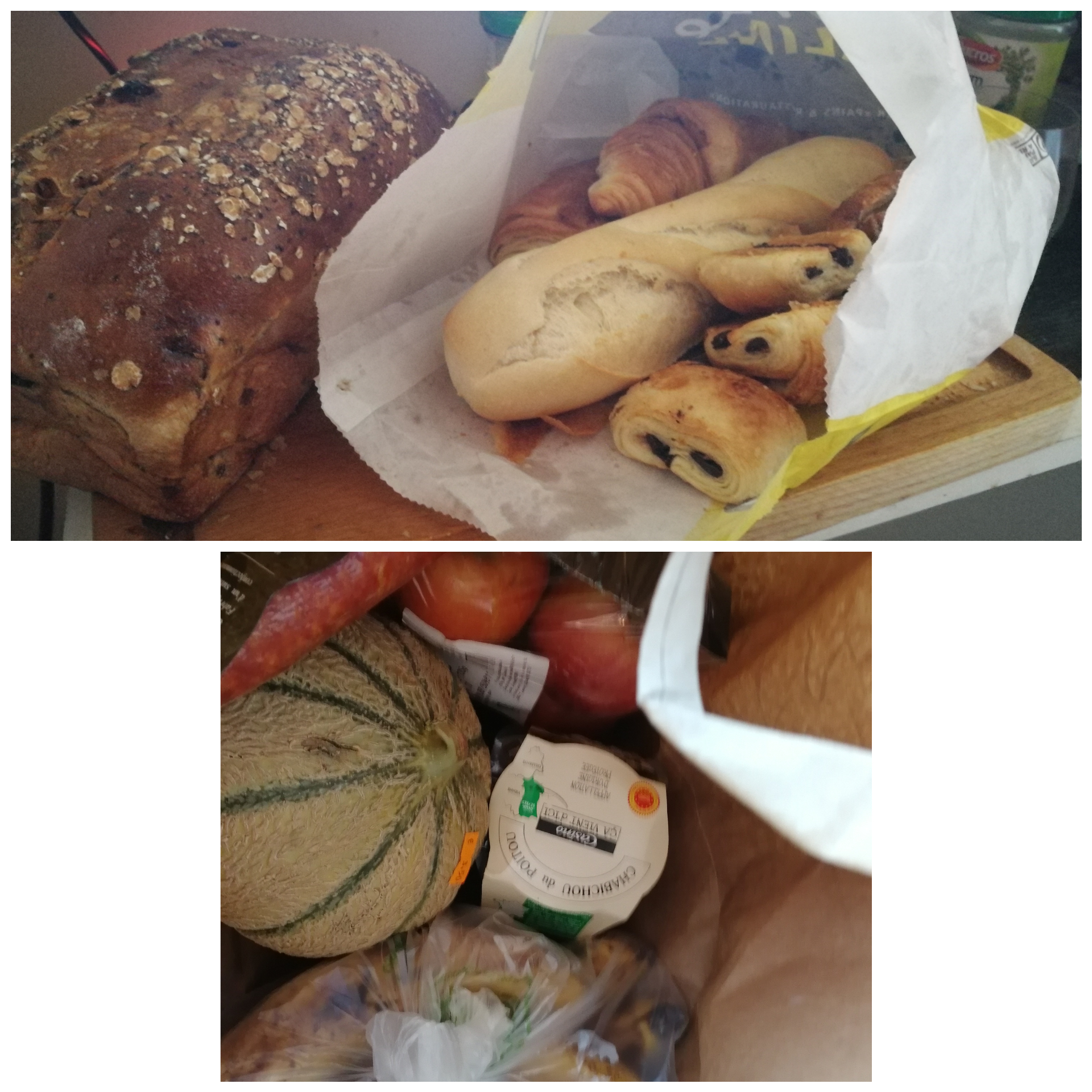 J'ai eu pour la boulangerie une mini baguette, une brioche, des pains au chocolat et des croissants et des mini pains au chocolat, et pour l'épicerie un melon, des bananes, des pommes, des saucisses (diots) et un fromage de chèvre.