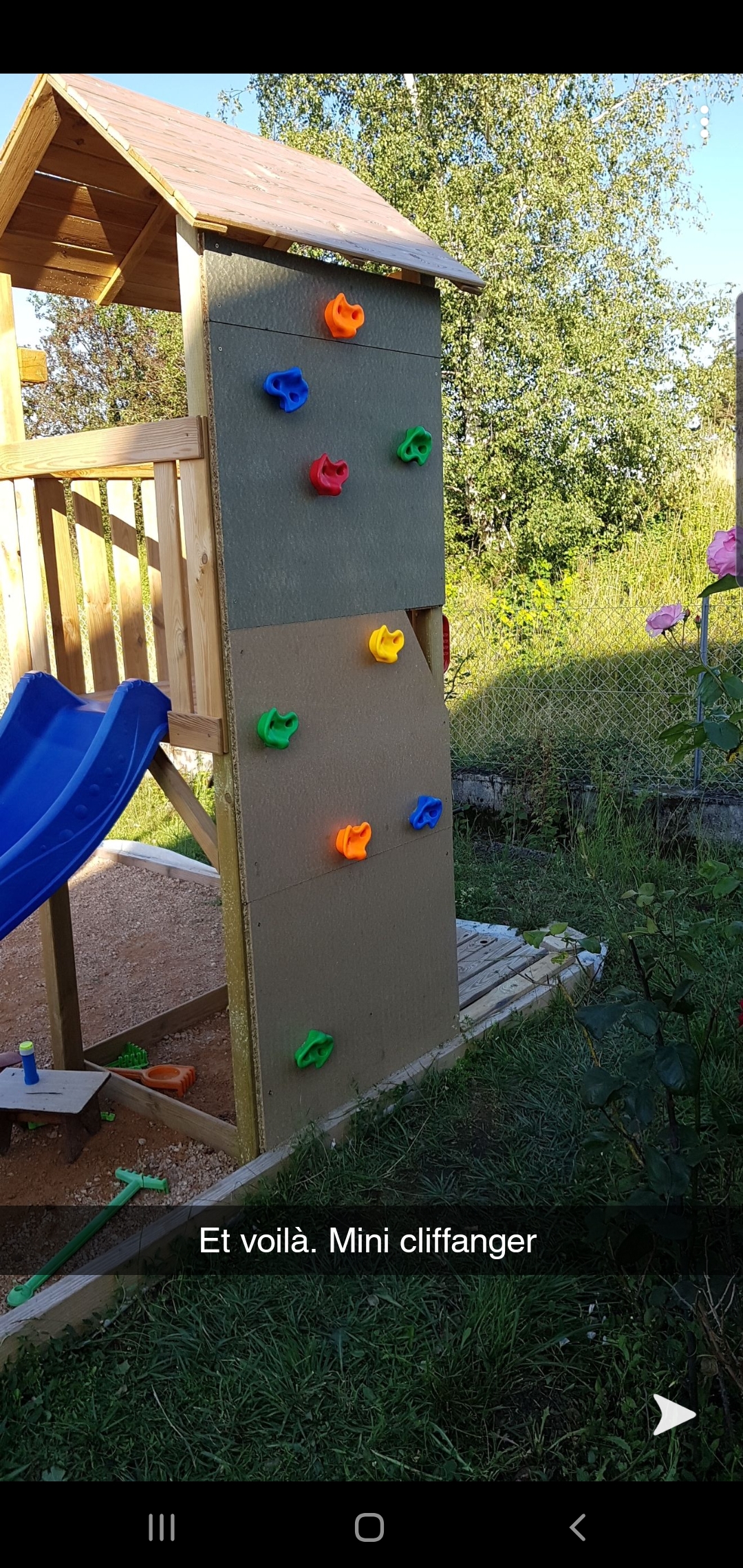 J'ai rentabilisé le portique extérieur, j'ai mis de l'agglo hydrofuge et acheté les poignées sur amazone, ce we je vais allez chercher une corde d'escalade et un petit harnais pour l'assurer, il n'a que 3 ans 1/2, hauteur du mur environ 3,2 m.