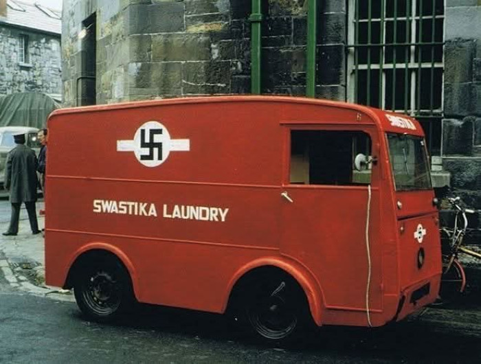 La blanchisserie Swastika était une entreprise irlandaise fondée en 1912. Ces camionnettes électriques étaient peintes en rouge vif et arboraient fièrement le logo de l'entreprise : une croix gammée noire sur fond blanc. Elles devinrent un spectacle familier dans les rues de Dublin, assurant la collecte et la livraison du linge. L'entreprise misait sur l'efficacité grâce à l'utilisation de véhicules et de machines électriques de pointe.
