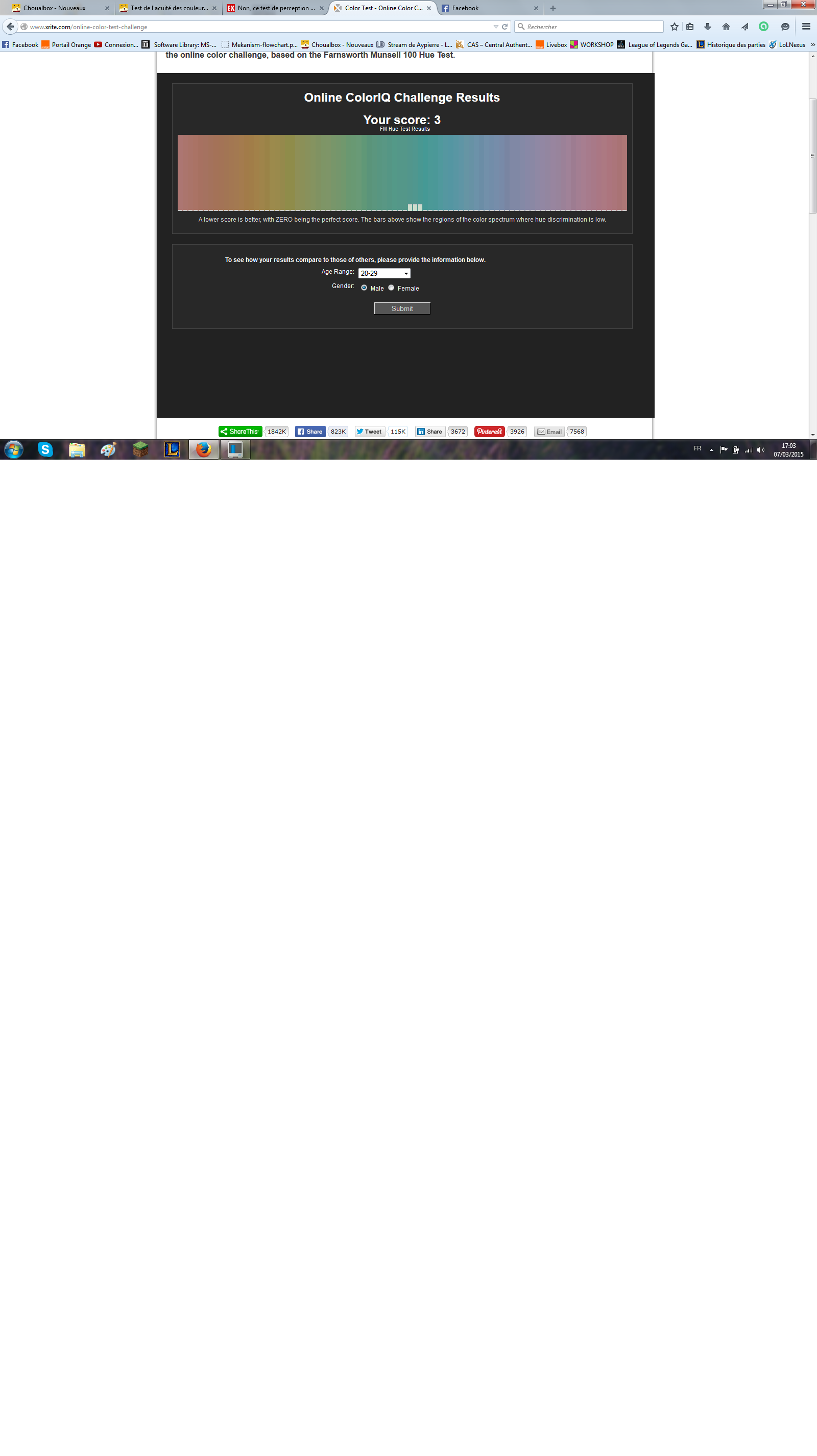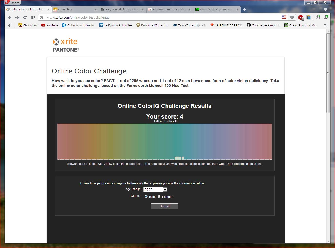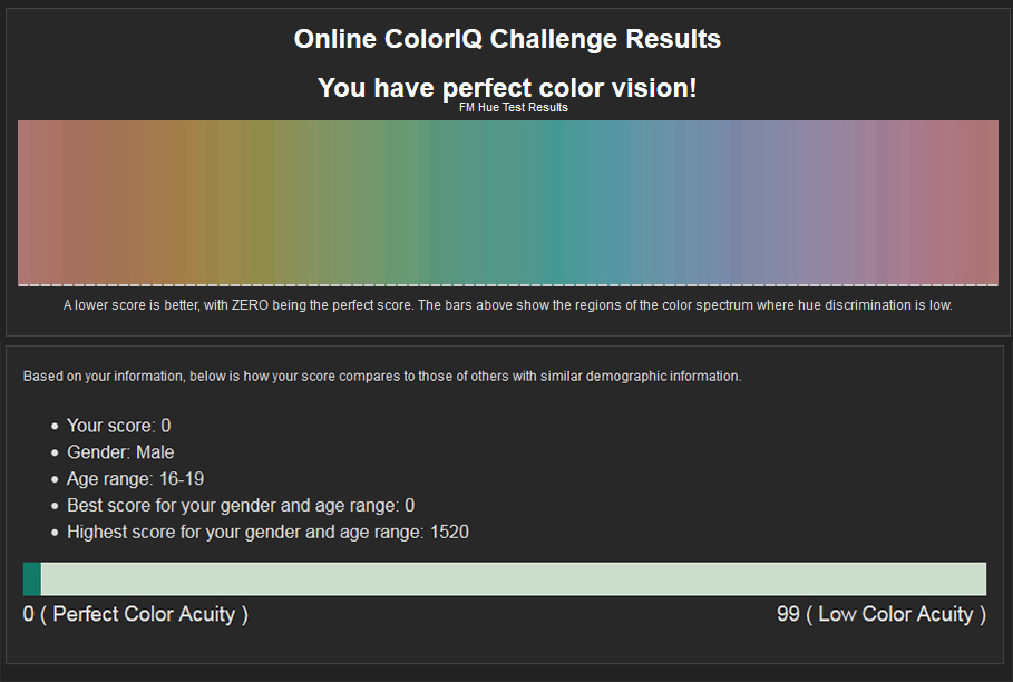 Pour info c'est bien pour faire mumuse mais c'est pas un vrai test. Le test de 15 hue saturé et dé-saturé requiert une colorimétrie, une luminosité, un luminance et bien d'autres paramètres très strict. Alors ne vous en faite pas si vous n'avez pas un bon score ou au contraire si vous avez tout bon.