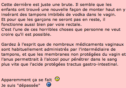 explication, tampon imbibé de vodka dans la chatte pour les filles, dans le cul pour les garçons = cuite plus rapide et plus longue, pas de vomissement, mais des malaises...