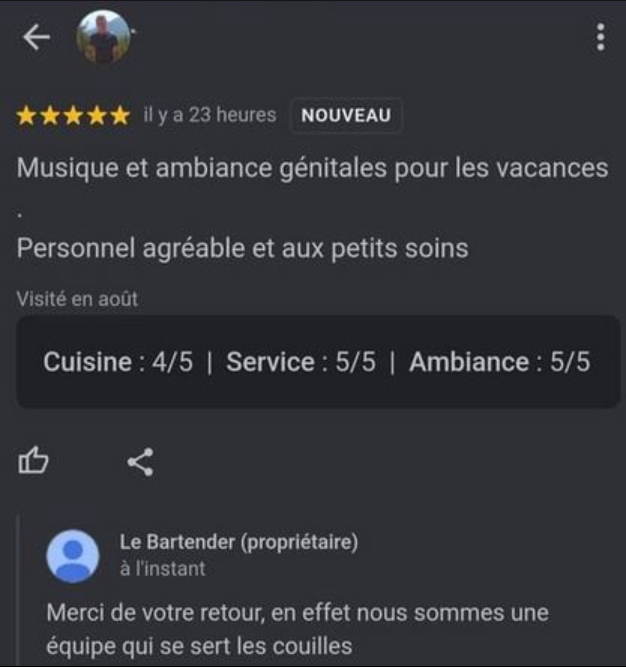pas forcément si le bartender n’a pas les couilles d’assumer la blague et à refait son com juste après le screen