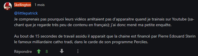 je vois toujours les vidéos de cette chaîne relayées sur les RS par des boomers réacs accompagnés d'un petit "excellent" "triste réalité...." "à méditer"