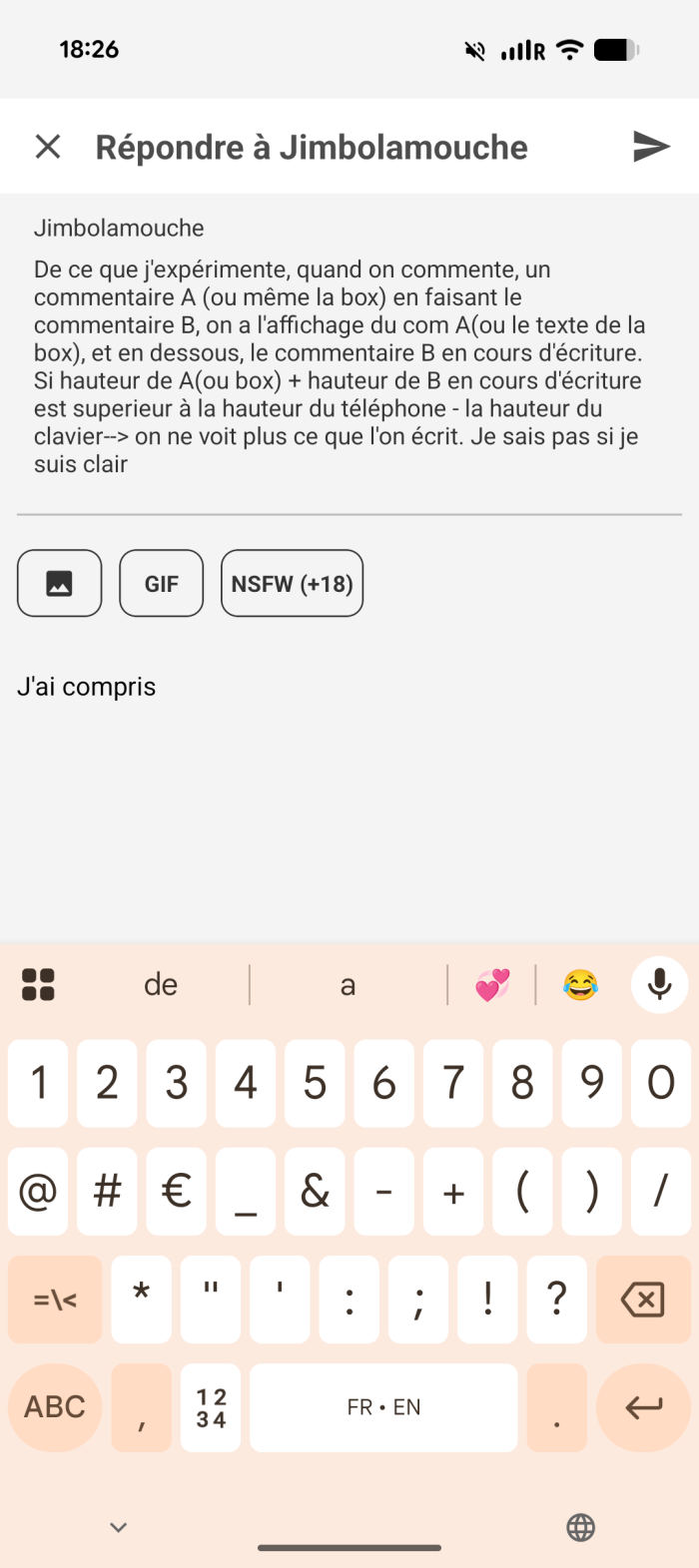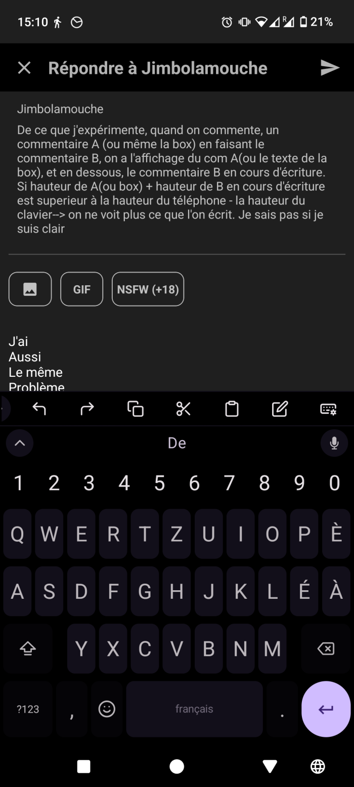 De ce que j'expérimente, quand on commente, un commentaire A (ou même la box) en faisant le commentaire B, on a l'affichage du com A(ou le texte de la box), et en dessous, le commentaire B en cours d'écriture.