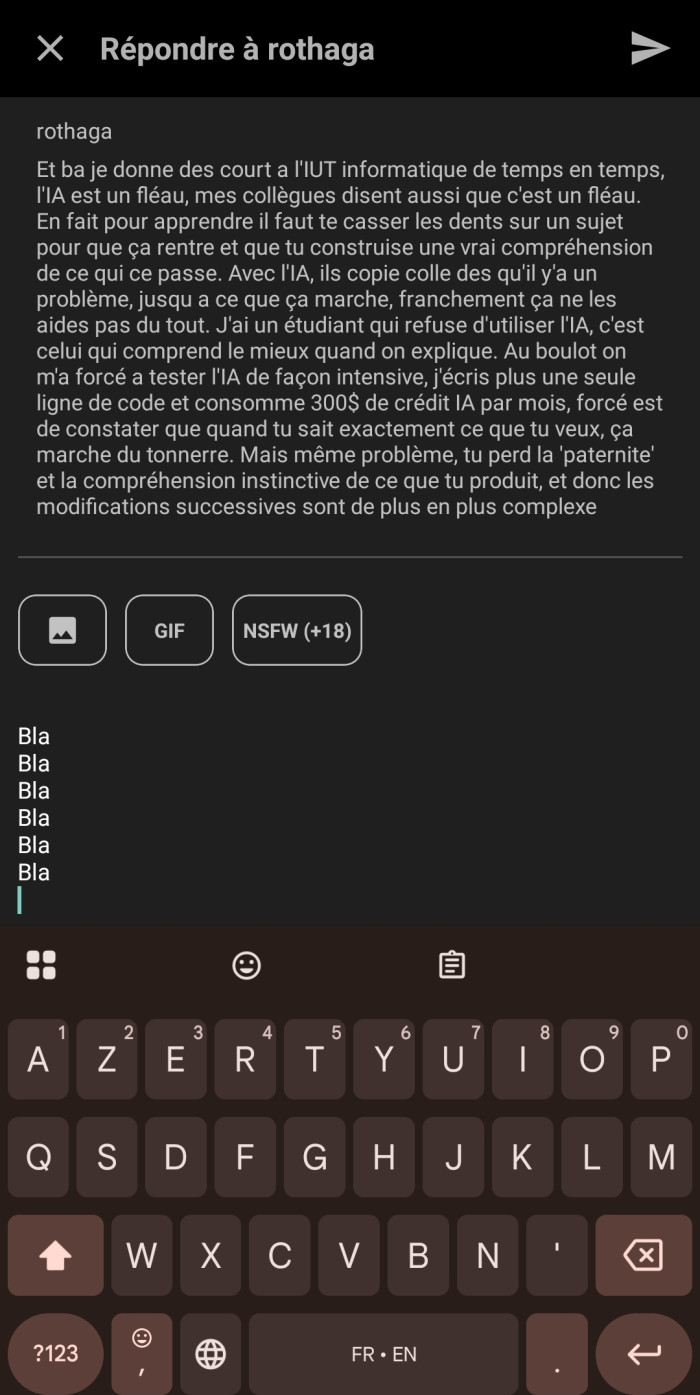 Au boulot on m'a forcé a tester l'IA de façon intensive, j'écris plus une seule ligne de code et consomme 300$ de crédit IA par mois, forcé est de constater que quand tu sait exactement ce que tu veux, ça marche du tonnerre.