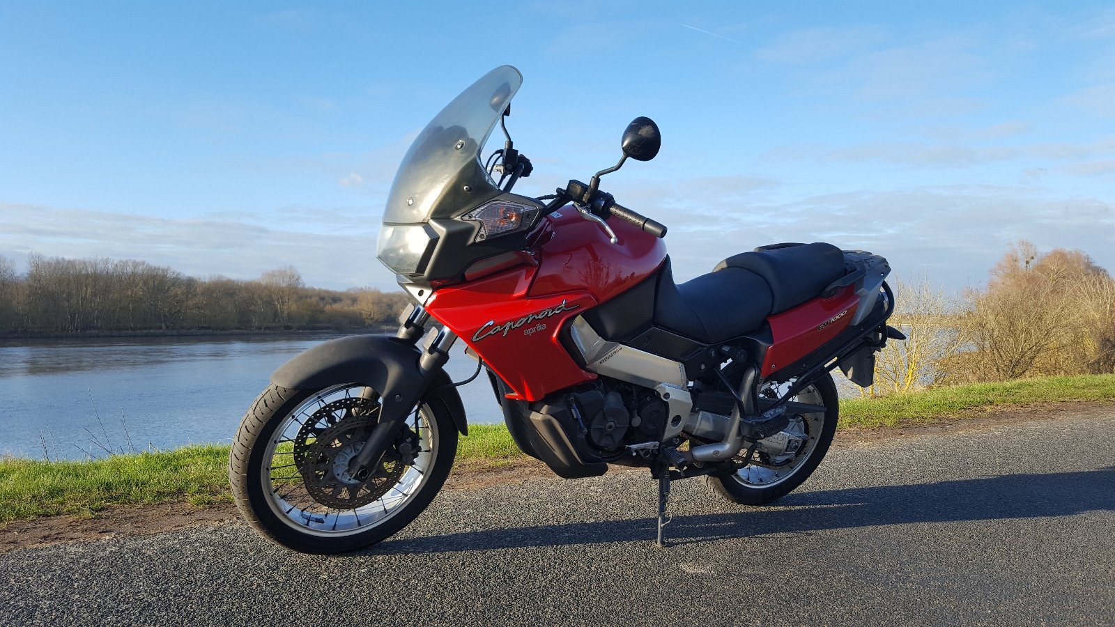 moi j'ai un Aprilia Caponord ETV1000 de 2003, ci-joint en photo sans les valises d'origine, de la même couleur, que j'affectionne particulièrement comparé à un bagster ou un top case.