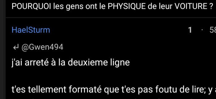Oui je vannes sur les bagnoles, et toi t'insultes et t'agresses.
