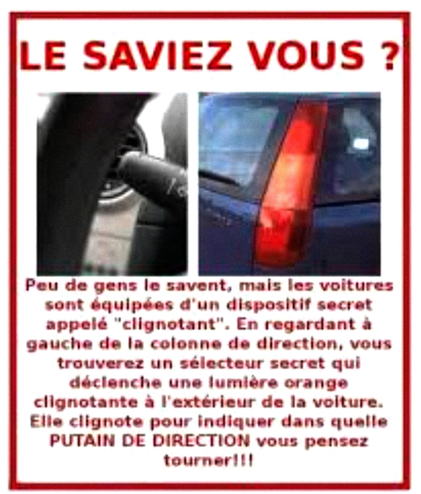 Le plus drôle ce sont les gens qui ont une obligation de tourner à droite car à gauche c'est sens unique et qu'ils mettent leur cligno à droite
