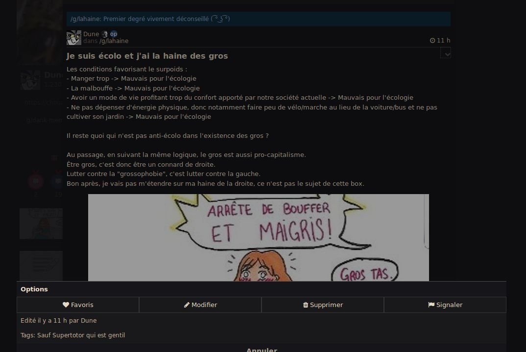 Totor c'est mon pote et je peux te le dire parce que je le vois de mes propres yeux, son obésité il en souffre vraiment et c'est un problème contre lequel il n'a pas la possibilité de lutter comme certains privilégiés, alors je pense qu'il a quand même un peu le droit de se plaindre de temps en temps des insultes qu'il subit tout le temps.