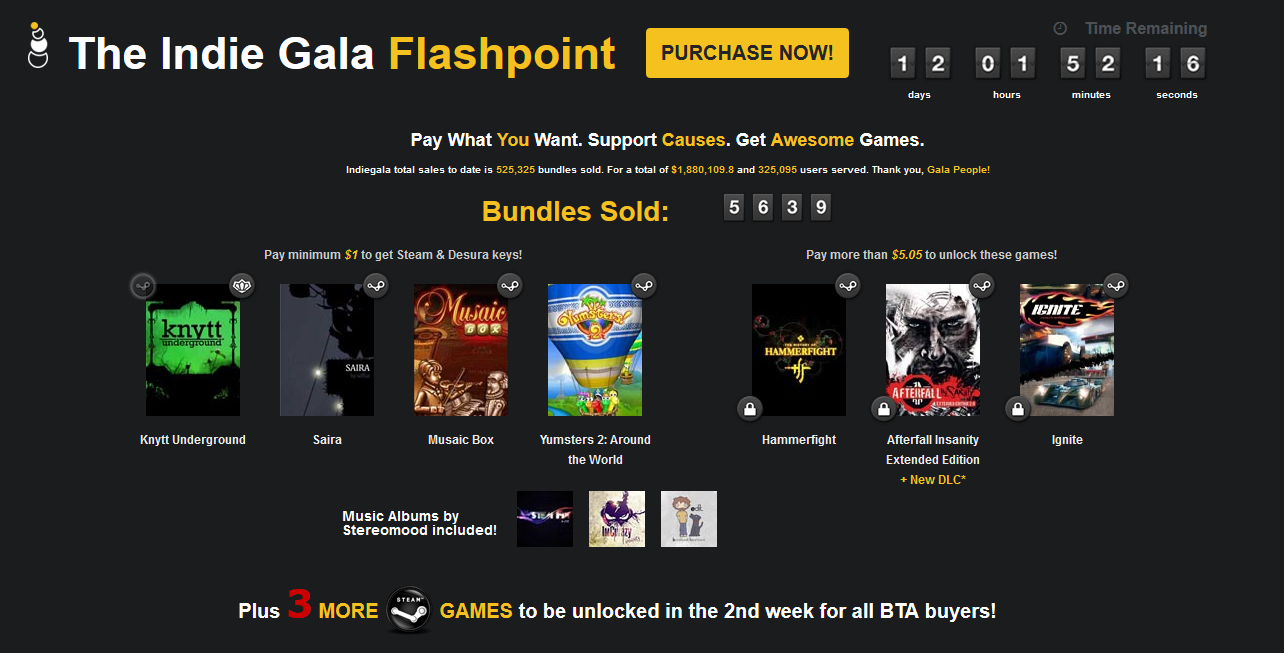 Suite au refus catégorique du groupe Bundle ( http://choualbox.com/T0AJ0 ), je commence ma première box d'une (j’espère) longue série. Pour chaque box j'essayerais de mettre un minimum d'info ( Screen, listing, appréciation personnel des jeux que j'ai tester, prix minimum ext...) On commence donc avec L'Indie Gala Flashpoint : http://www.indiegala.com/