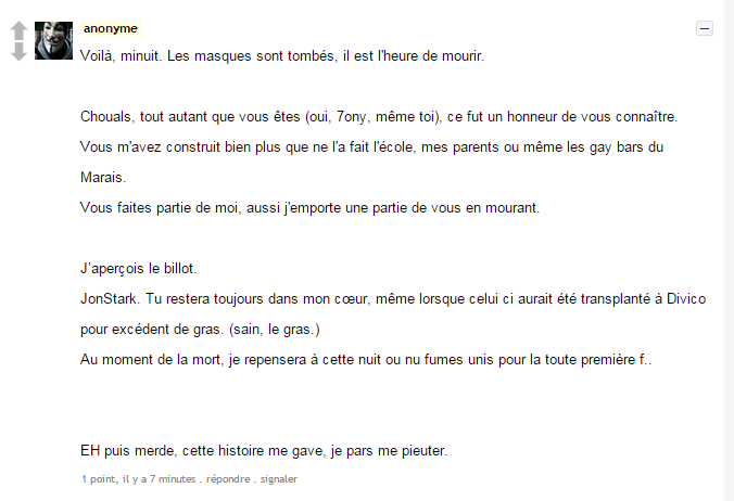 Pour nous qui avons donné notre amour à cette communauté, qui lui avons versé notre sang, qui lui avons sacrifié notre vie sociale, des milliers de litres se secrétions intimes, des photos non contractuelles de nos copines, ainsi que les tréfonds les plus puants de notre âme viciée!