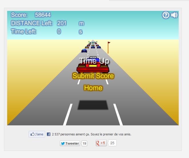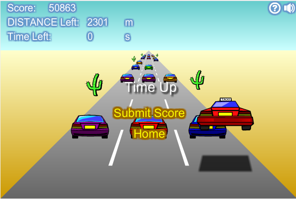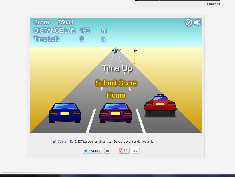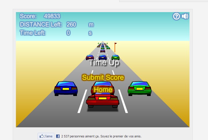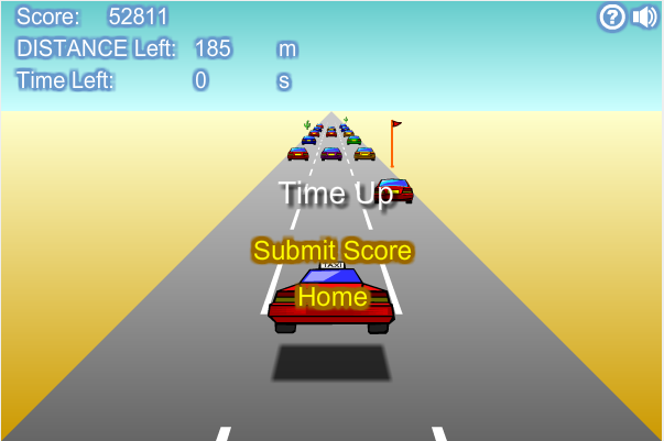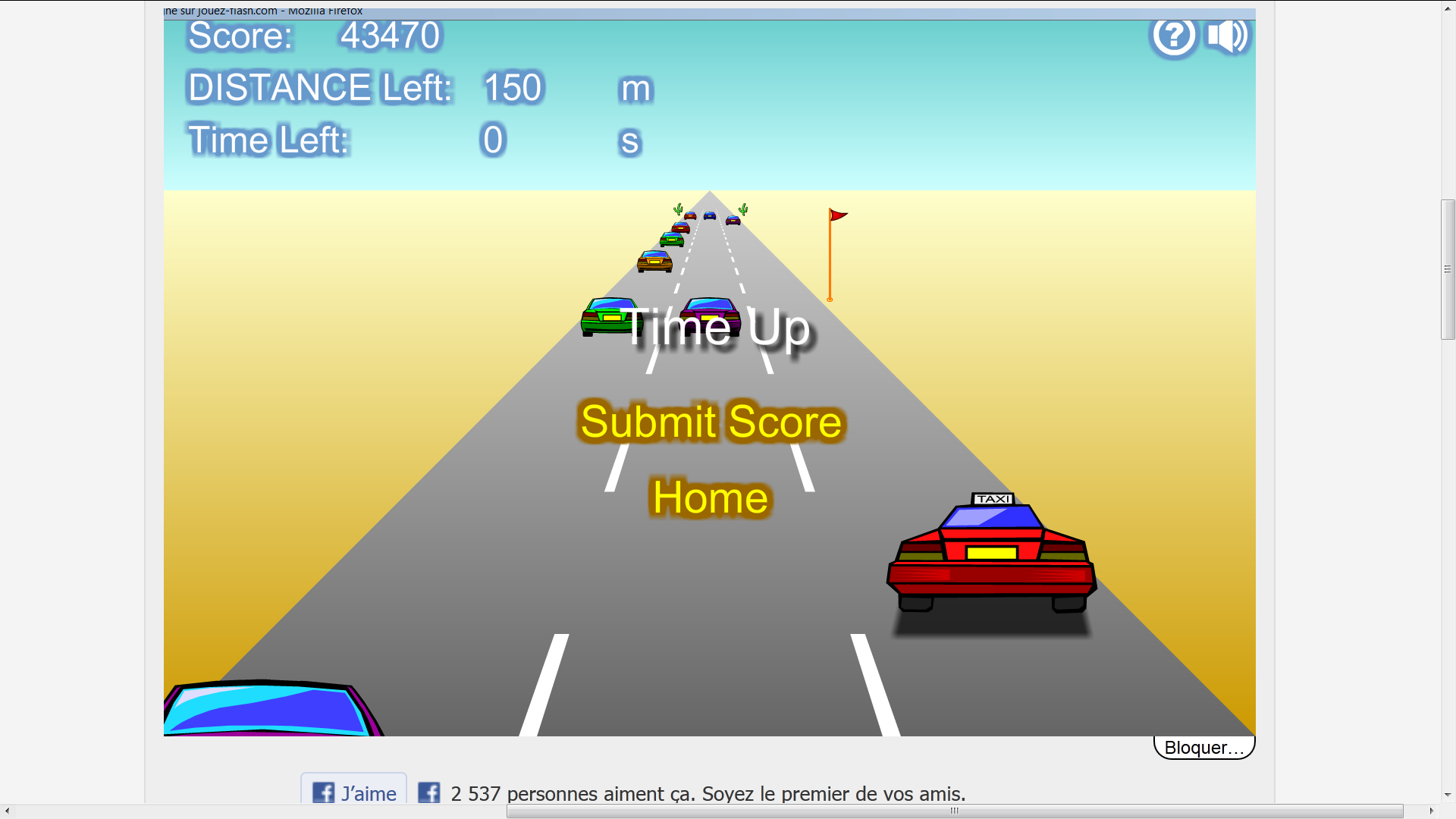 Jeu : Vous êtes un taxi et devez emmener votre client le plus loin possible en esquivant les voitures qui vous bloquent le passage. Le jeu s\'arrête à la fin du compte a rebours, que vous pouvez repousser en passant des check point.