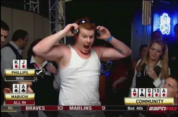 faut le comprendre pour replacer les evenement c\'est le WSOP 2008, 10 000 dollars d\'entrée il joue depuis trois jours et se prends un bad beat à une chance sur 2.7 milliards . franchemen, c\'est deja un miracle qu\'il ne se soit pas suicidé dans sa chambre .